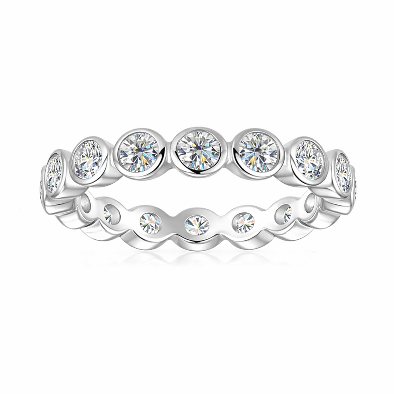 Questo anello eternity è un capolavoro di luce e delicatezza: la disposizione delle pietre in castoni rotondi singoli dona un effetto ordinato, lussuoso e brillante, rendendolo un gioiello intramontabile da indossare ogni giorno o da regalare a chi ami.