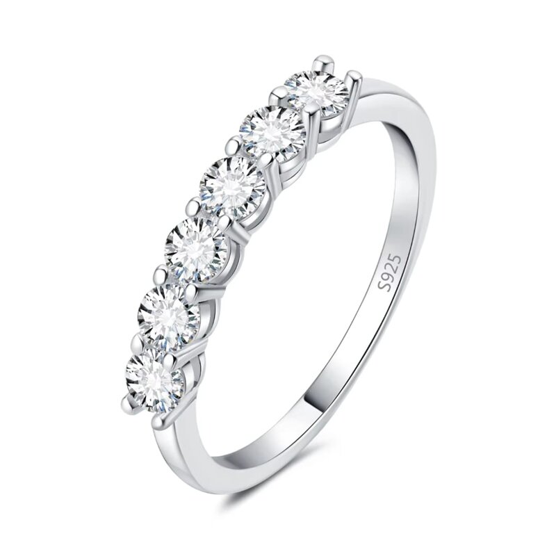 Descrizione del prodotto: Un anello elegante e raffinato, realizzato in Argento Sterling 925 con placcatura in oro bianco 18K. È impreziosito da 7 Moissaniti da 0.1 ct ciascuna (3.0 mm), per un totale di 0.7 ct, taglio brillante rotondo. Il design a veretta rende questo gioiello ideale da indossare ogni giorno, perfetto anche come anello di anniversario o dono speciale, simbolo di amore e continuità.