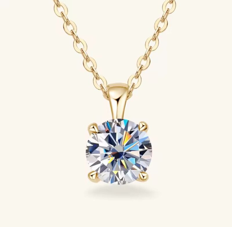 Descrizione del prodotto:Un gioiello raffinato e luminoso, pensato per chi ama la purezza e l’eleganza senza tempo.Realizzata in Argento Sterling 925 con placcatura in Oro Giallo 18k, questa collana presenta una Moissanite certificata GRA da 1.0 ct (6.5 mm) incastonata a 4 griffe, che ne esaltano al massimo brillantezza e intensità.Perfetta come dono prezioso o come dettaglio unico da indossare ogni giorno con stile.Caratteristiche principali- Materiale: Argento Sterling 925 placcato Oro Giallo 18k