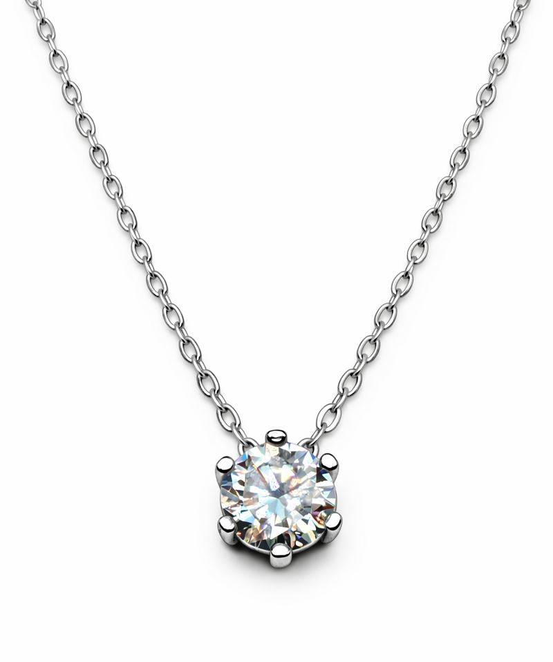 Un classico intramontabile, elegante e luminoso: la Collana Punto Luce con Moissanite da 1 ct, realizzata in argento sterling 925 placcato oro bianco, perfetta per valorizzare ogni look con un tocco raffinato e senza tempo.